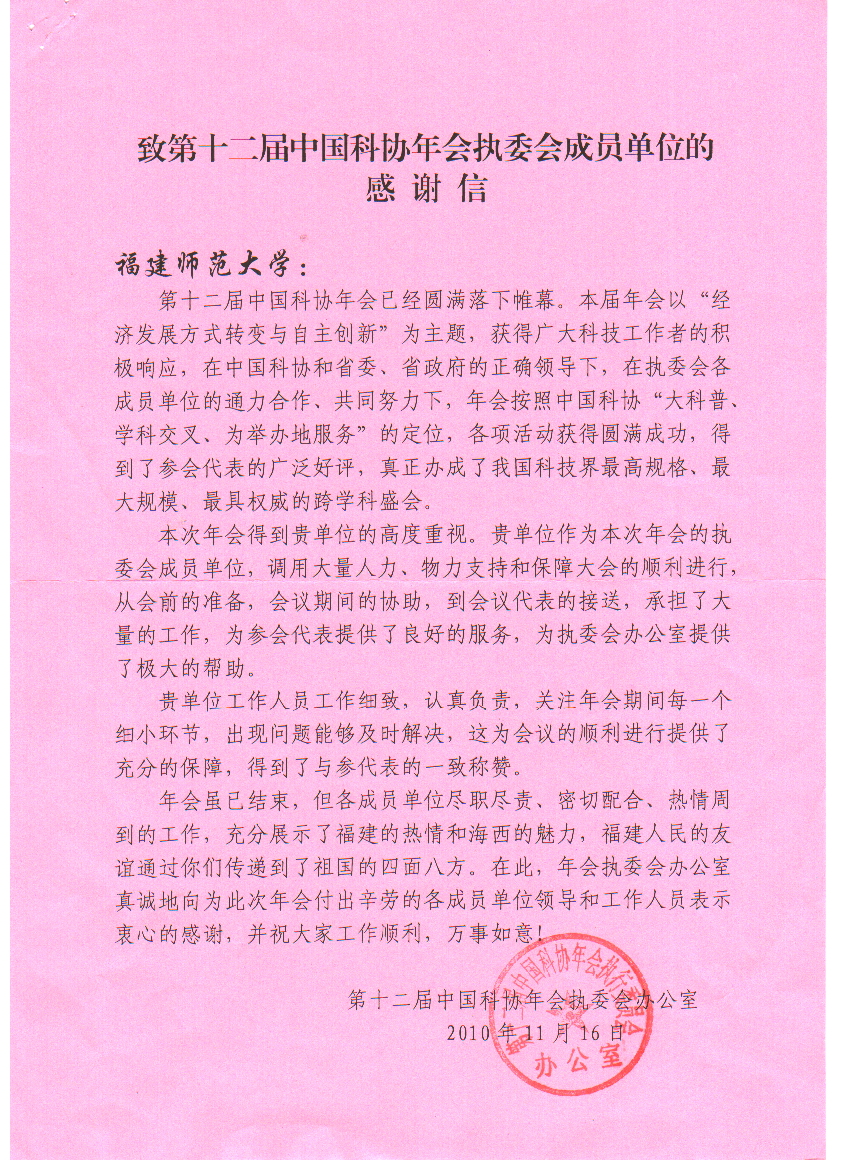 第十二届中国科协年会执委会办公室致完美(中国)官方感谢信