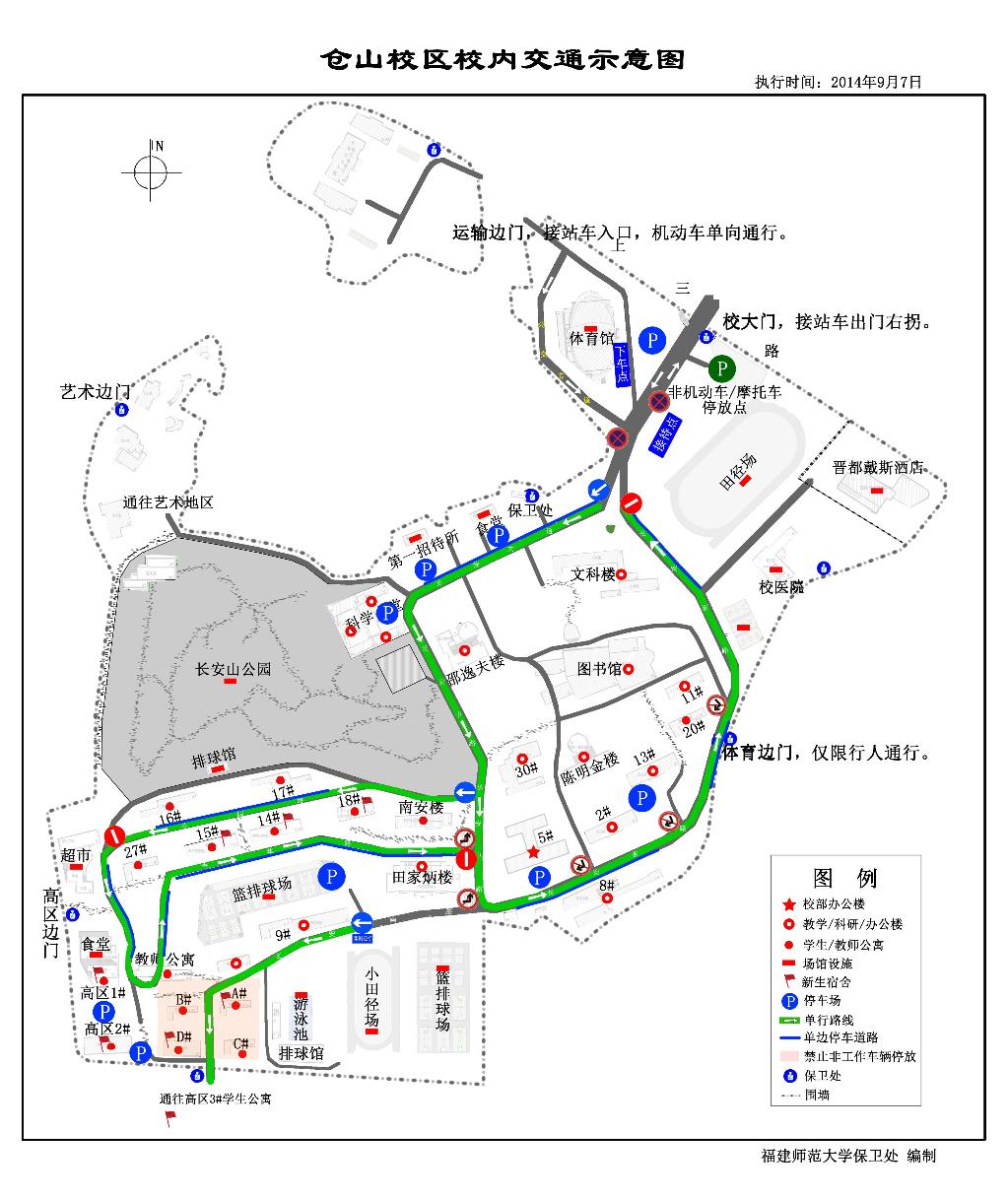 3.小东门(明德路)、星槎桥门、龙江中路、仓山大道北段、明德路、溪源路北段实行单向通行,北部生活区西门禁止机动车通行,请严格按交通示意图行驶,严禁逆向行驶。