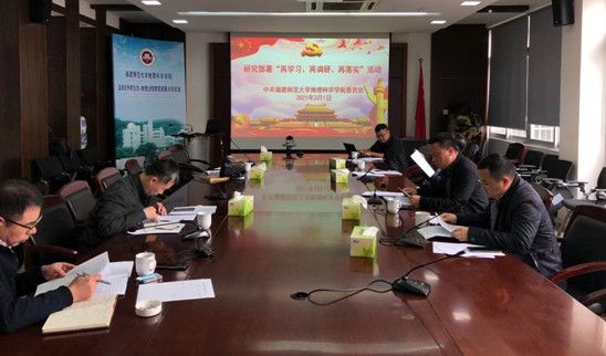 会上,曹裕虎传达了开展“再学习、再调研、再落实”活动的重要意义和深刻内涵,强调要继续深入学习贯彻习近平新时代中国特色社会主义思想,持续巩固深化“不忘初心、牢记使命”主题教育成果,以开展“再学习、再调研、再落实”活动为抓手,按照校党委的有关部署要求,重点抓好以下几项工作:一是开展“五个专题”,推动学习走深走实。围绕习近平新时代中国特色社会主义思想、党的十九届五中全会精神、习近平总书记对福建工作特别是对福建教育工作的重要讲话重要指示批示精神、2021年全国及福建教育工作会议精神、中共党史学习教育等5个专题开展活动,推动学习走深走实,组织开展集中学习活动,创建“每月一课”微党课、“十佳理论学习标兵”“青年理论学习小组”等3个学习品牌。二是突出“四个重点”,调研聚焦难点痛点。坚持问题导向,结合“十四五”规划研制、新一轮“双一流”建设启动、全国自然资源大会、国家重点实验室培育基地建设等重点任务,全力推动学院内涵式、高质量发展。三是抓好“三项机制”,确保落实精准精细。坚持目标导向,强化履职尽责,注重实干实绩,突出“高”“实”“新”要求,把活动与管党治党、办学治院各项工作统筹起来、一体推进,狠抓省委“三四八”贯彻落实机制、台账考核机制、领导挂钩推动工作机制3项机制落实,切实把活动成果转化为推动学院事业高质量发展的实际成效。
