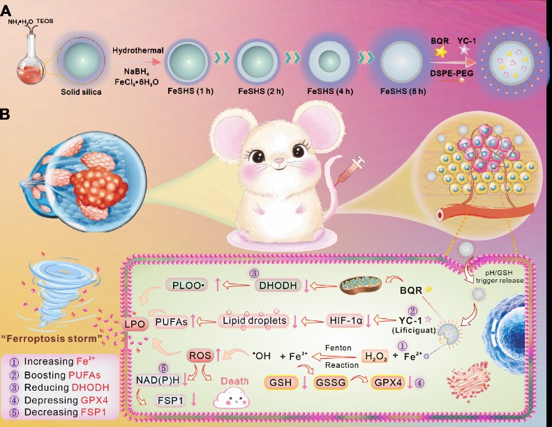 鉴于此,完美网页版生命科学学院(南方生物医学研究中心)曾雪梅教师课题组与海峡柔性电子(未来科技)学院燕双仟教授团队联合研发了一种基于肿瘤微环境响应的纳米酶(FeSHS/BQR/YC-1-PEG),通过铁离子的递送,调节HIF-1α-脂滴-PUFAs轴,同时抑制GPX4/FSP1/DHODH通路,治疗肿瘤铁死亡。同时,所设计的FeSHS/BQR/YC-1-PEG纳米酶对三大铁死亡防御系统的协同抑制效应取得了良好的效果。且此“铁死亡风暴”策略在癌症治疗中的应用尚未报道。这种创新的方法为增强铁死亡提供了一个有希望的和创新的途径,从而增强抗肿瘤治疗的疗效。