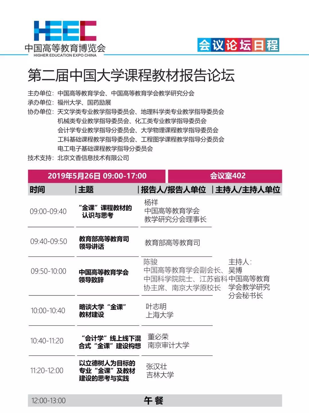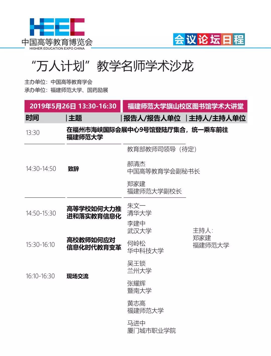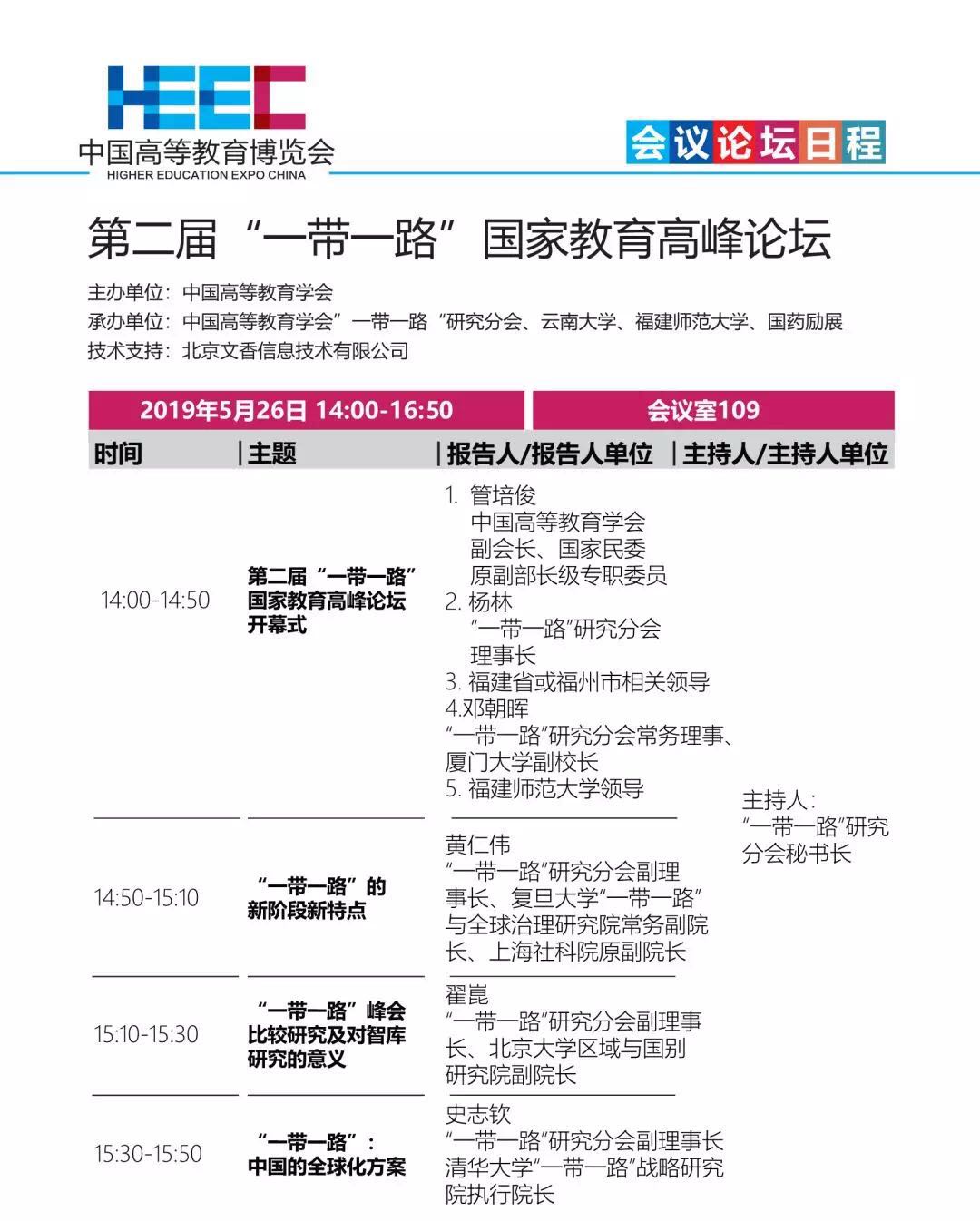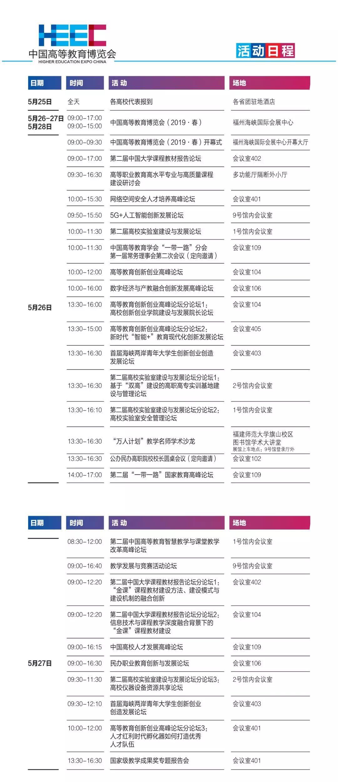 由中国高等教育学会主办,福建省高等教育学会,完美网页版参与承办和协办,以“讴歌新中国70年辉煌成就 推进教育现代化创新发展”为主题的中国高等教育博览会(2019·春)将于5月26日至28日在福州海峡国际会展中心举办。本届展会将为大家带来千余家参展企业、2500余个展位、6万平方米展出面积、上万件展示产品,20余个高峰论坛、160余场专题报告。其中,完美(中国)官方还作为具体承办单位承办“万人计划”教学名师学术沙龙、国家级教学成果奖专题报告会、中国高等教育学会“一带一路”研究分会第一届理事会及第二届“一带一路”国家教育高峰论坛等活动。会议论坛日程如下: