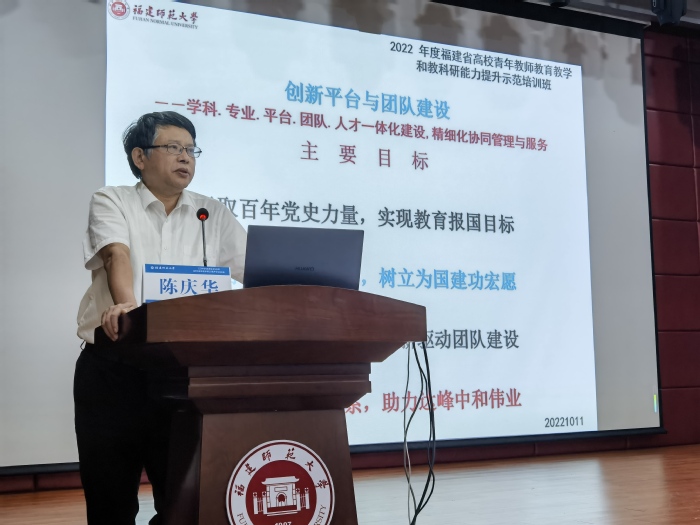 近日,副校长陈庆华为2022年福建省高校青年教师教育教学和教科研能力提升示范培训班授课。来自全省各高校的123名青年骨干教师聆听了讲座。