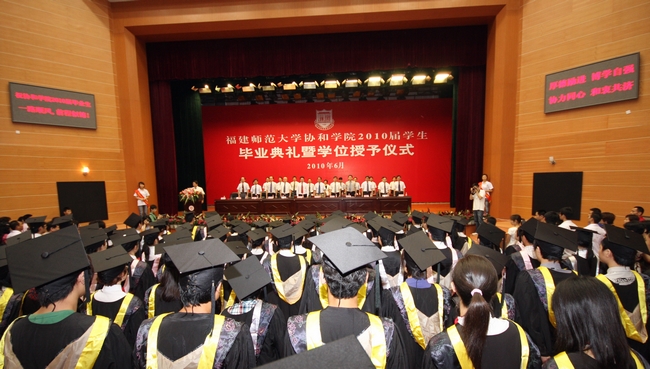 毕业典礼暨学位授予仪式于6月20日上午在旗山校区大会堂隆重举行。校党委书记罗萤,校长、协和学院董事长黄汉升,校党委副书记、协和学院党委书记游小波,副校长、协和学院副董事长许明,协和学院副董事长、福建盈峰教育投资有限公司总裁喻龙,协和学院副董事长、校资产经营公司总经理赵钦,协和学院董事、学校有关职能部门负责人,学院党政领导、各系负责人,教师代表、毕业班辅导员、部分学生家长以及协和学院2010届全体本科毕业生参加了典礼。