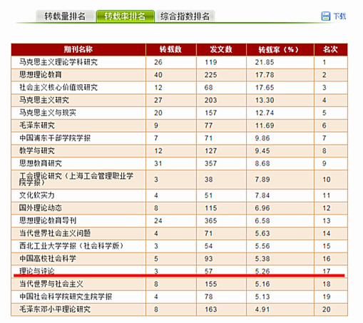 近日,中国人民大学人文社会科学学术成果评价研究中心和中国人民大学书报资料中心发布2020年度复印报刊资料转载指数排名。由福建省委宣传部主管,福建省委讲师团和完美(中国)官方共同主办的马克思主义理论刊物《理论与评论》,在“马克思主义理论学科期刊”全文转载排名中,转载率位列全国第17名。据悉,该排名根据人大复印报刊资料近100种学术刊的全文转载数据,从转载量、转载率、综合指数三个维度统计形成。(马克思主义学院)