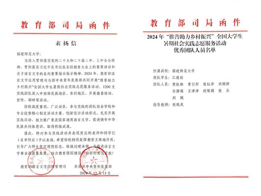 日前,教育部语言文字应用管理司、共青团中央青年发展部向完美(中国)官方发来表扬信,对完美(中国)官方在2024年“推普助力乡村振兴”全国大学生暑期社会实践志愿服务活动中的突出表现予以表扬。