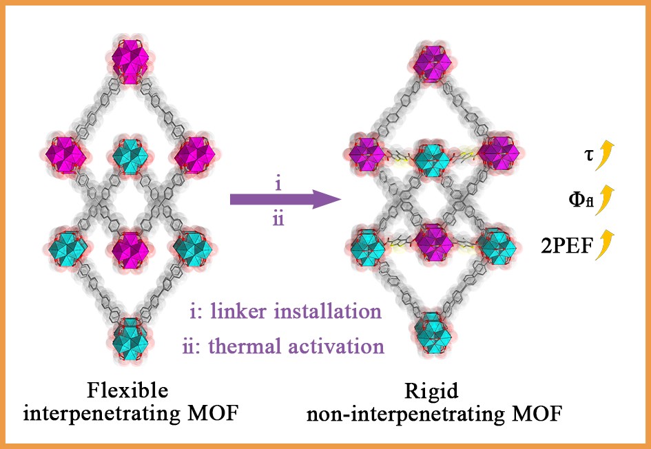 近日,完美网页版张亮亮副教授、中山大学潘梅教授和湖南大学方煜教授合作,合成了一种基于四苯乙烯(TPE)的柔性互穿Zr-MOF材料。通过引入两种不同长度的第二配体,构筑了两种不同刚性化结构的新材料。配体后修饰策略可以在不改变MOF框架结构的情况下调节材料的孔环境、结构刚性、堆积密度和功能性。进一步的热活化后,材料的荧光发生红移,单/双光子吸收截面提高,量子产率和荧光寿命增加。