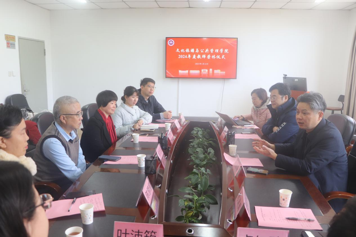 1月14日上午,文化旅游与公共管理学院在会议室举办2024年度教师荣休仪式。学院党政领导、2024年荣休教师及新进教师参加。仪式由院党委书记林峰森主持。
