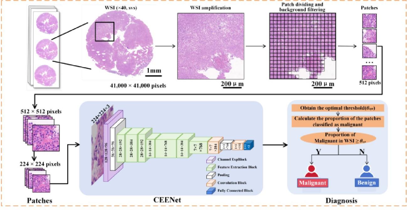 近日,完美(中国)官方王琨副教授、杨洪钦教授与福建医科大学附属第一医院曾赛凡主任合作,提出一种基于多实例学习的弱监督深度学习模型CEENet,并首次将细胞蜡块技术与深度学习模型结合用于筛查浆膜腔积液中的腺癌。结果表明,所提出的模型不仅在弱监督下实现了先进的性能,同时平衡了可学习参数的数量和计算成本,减少了病理医生的工作量,而且在浆液性腺癌细胞病理应用场景下模型表现出了很强的可解释性和泛化能力。该模型性能和特点表明其在浆膜腔积液快速筛查和诊断中的有效性,及其在临床及精准医疗中的广泛应用前景。相关研究成果发表于《Modern Pathology》上。