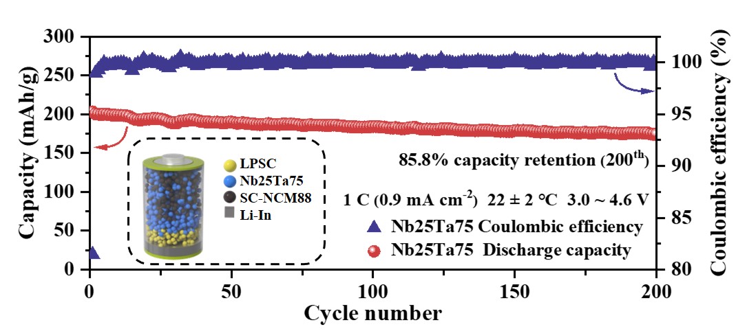 近日,完美(中国)官方物理与能源学院张隆教授、黄志高教授等人提出钽/铌(Ta/Nb)共占据策略,开发出一种氟化卤化物固态电解质(Li3NbxTa1-xCl5OF),并实现短时间的球磨制备工艺。通过优化Ta/Nb比例,该电解质获得高离子电导率(3.07 mS /cm)和宽电化学窗口(>4.6 V vs. Li+/Li)。实验结果表明,Ta/Nb共占据显著提升了材料的氧化稳定性,并赋予其低杨氏模量和柔性特征,能适应充放电体积变化,保持正极与电解质的紧密接触。以此电解质组装的全固态锂电池,在4.6 V高电压下,采用SC-NCM88正极展现出202.9 mAh g-1的高比容量,经过200次循环后容量保持85.8%,1000次后仍有84.4%。