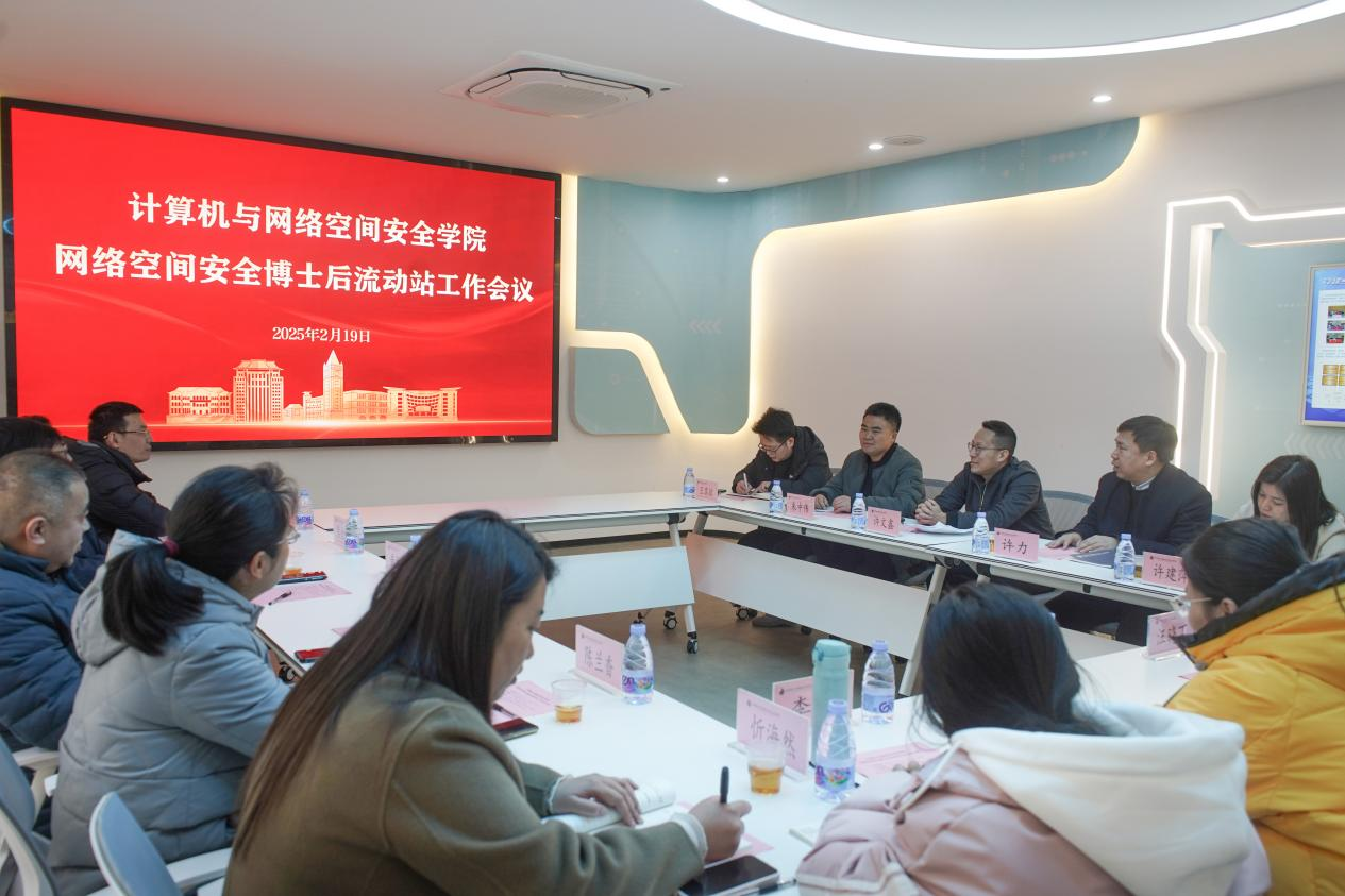 近日,计算机与网络空间安全学院召开网络空间安全博士后流动站工作会议。人事处(高层次人才工作办公室)副处长(副主任)朱中伟,体育科学学院院长许文鑫,学院领导许力、许建萍,学院博士后合作导师及相关教师、博士后流动站具体经办人员等参加会议。会议由院长许力主持。
