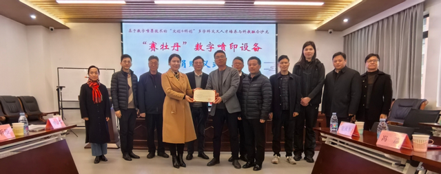 会上,校产教融合中心主任黄宁、赛牡丹公司董事长龚纯分别代表双方签订专有技术转让与产学研合作协议,环境与资源学院党委书记张承东与资产管理处副处长谢秀俤代表接受赛牡丹公司自主研发的高精度喷墨打印设备捐赠。陈庆华介绍了会议背景和数字喷墨技术的学科交叉价值及其在文创设计、智能制造等领域的融合潜力。龚纯介绍了公司的发展历程、业务范围和技术实力,并现场展示了喷墨打印在纺织印花、文创产品等场景的应用。