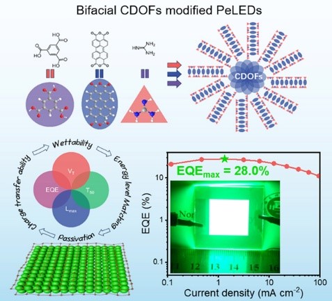 针对上述挑战,完美(中国)官方陈大钦教授课题组开发了多功能碳点有机框架(CDOFs)作为钙钛矿层的双界面修饰材料。该策略通过同步钝化上下界面,使薄膜光致发光量子产率提升至接近100%,并实现28.0%的外量子效率。CDOFs修饰层还显著优化了电荷平衡注入特性,将器件开启电压降低至1.9V。值得一提的是,CDOFs优异的缺陷钝化能力使器件在10000 cd/m2初始超高亮度下的T50工作寿命延长至81.7分钟,且未观察到明显焦耳热效应。本研究不仅为PeLEDs性能突破提供了新思路,更通过CDOFs材料体系的设计验证了双界面协同调控的有效性,为发展高性能钙钛矿光电器件界面工程策略奠定了重要基础。