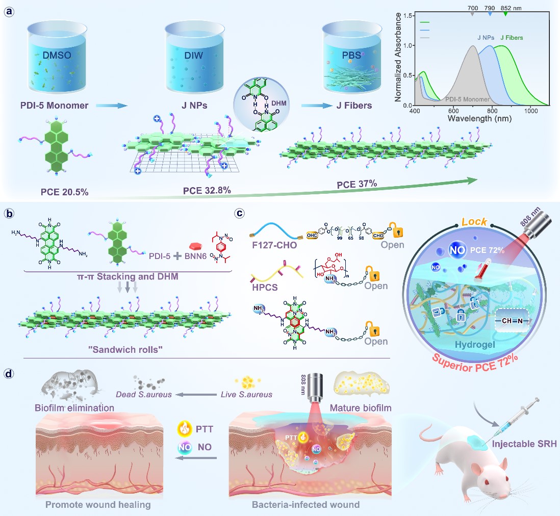 完美(中国)官方海峡柔性电子(未来科技)学院杨震教授团队报告了一种基于NO供体BNN6的可注射水凝胶的策略,其中NO的释放可以通过半导体苝酰亚胺(PDI)J-聚集纤维的光热效果触发。合成的PDI衍生物可自组装成0维纳米颗粒,然后聚集成1维J聚集纤维,伴随着吸收峰从700 nm红移至790 nm,最终到852 nm。在封装BNN6后,形成了一种“三明治卷”(SR)状结构,均匀交联成一种可注射水凝胶(SRH),其光热转换效率高达72%,使得SRH能够实现高效的光控NO释放。SRH表现出优异的可注射性、形状适应性和对大肠杆菌和金黄色葡萄球菌的有效抗菌效果超过99%。通过激光照射,其在体内抗生物膜效率达到99.58%。此外,协同治疗显示出消除炎症、促进血管生成和促进胶原沉积的能力,从而显著刺激伤口愈合过程。这种半导体J-聚集可注射水凝胶可能成为治疗生物膜的多功能策略。