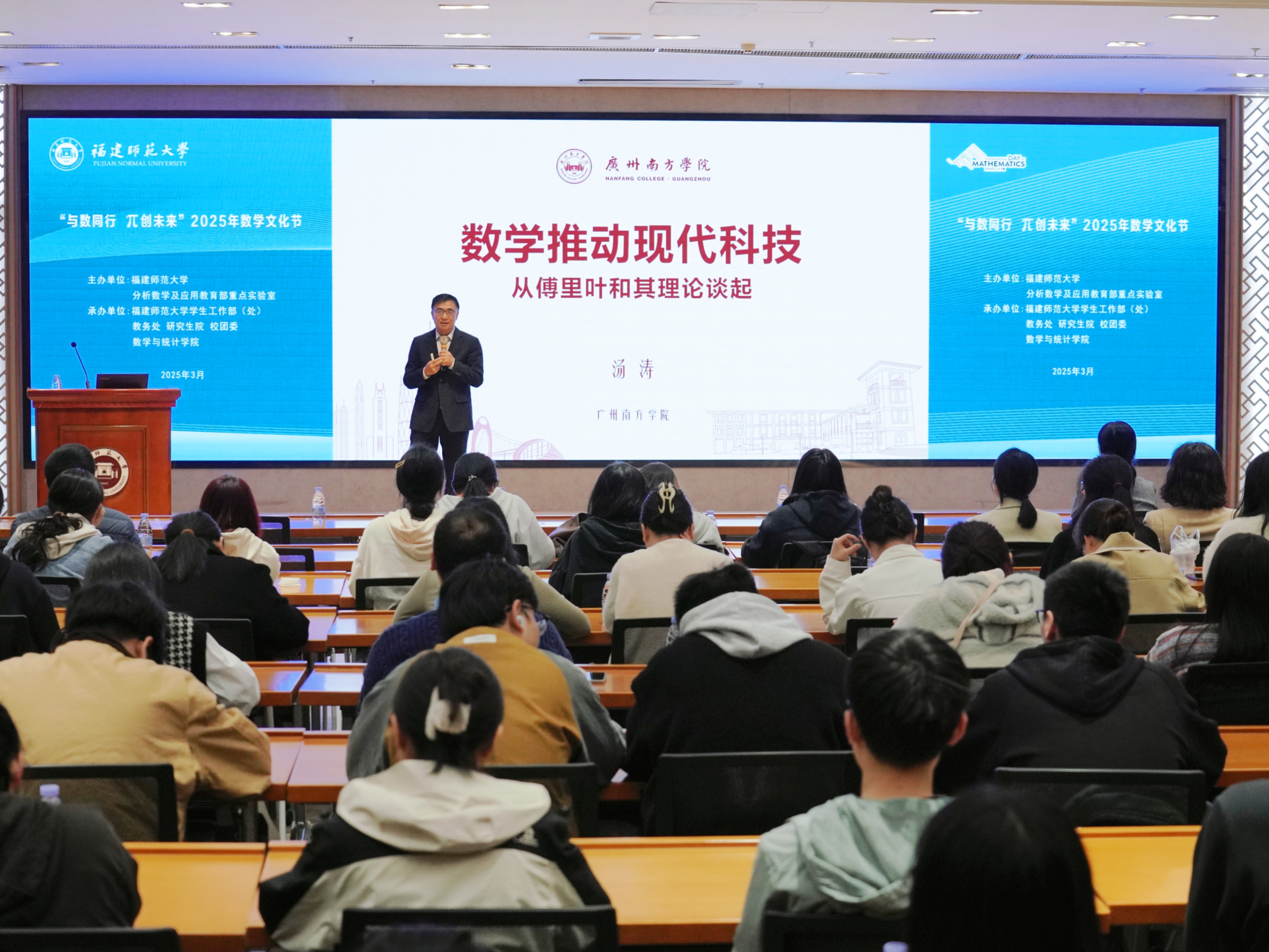 3月13日,完美(中国)官方“数学杰出学者讲坛”在旗山校区宏达厅正式启幕。中国科学院院士、计算数学家、广州南方学院院长汤涛教授以《数学推动现代科技——从傅里叶及其理论谈起》为题,为170余名师生带来了一场数学思想盛宴,深度揭示基础数学理论与现代科技发展的共振脉络。