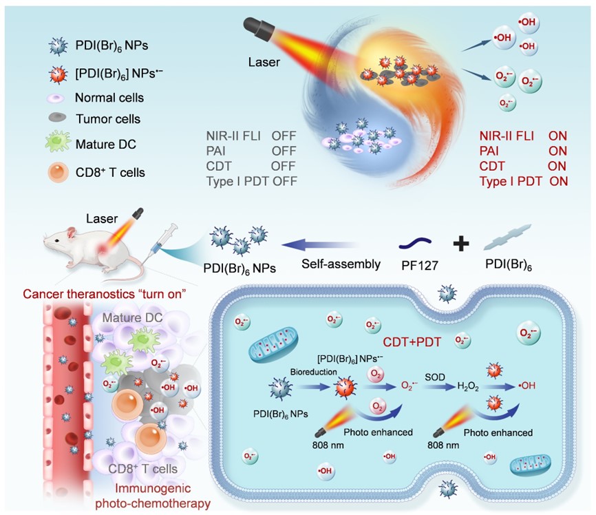 近日,我院杨震教授团队在国际顶尖期刊《Advanced Science》发表题为”Semiconducting Open-shell Radicals for Precise Tumor Activatable Phototheranostics”的研究性论文。文章介绍了一种肿瘤特异性激活的有机半导体自由基纳米光敏剂([PDI(Br)6]•− NPs),能够实现在“点亮型”二区荧光和光声成像指导下实施对肿瘤的精准光免疫治疗。[PDI(Br)6]•− NPs能在肿瘤的还原微环境中被特异性激活,并具有优异的I型光动力和化学动力学特性,不仅能直接杀死肿瘤细胞,还能诱导强大的免疫原性细胞死亡,激活抗肿瘤免疫反应。这种治疗策略为有机半导体自由基用于癌症精准治疗提供了重要了价值。