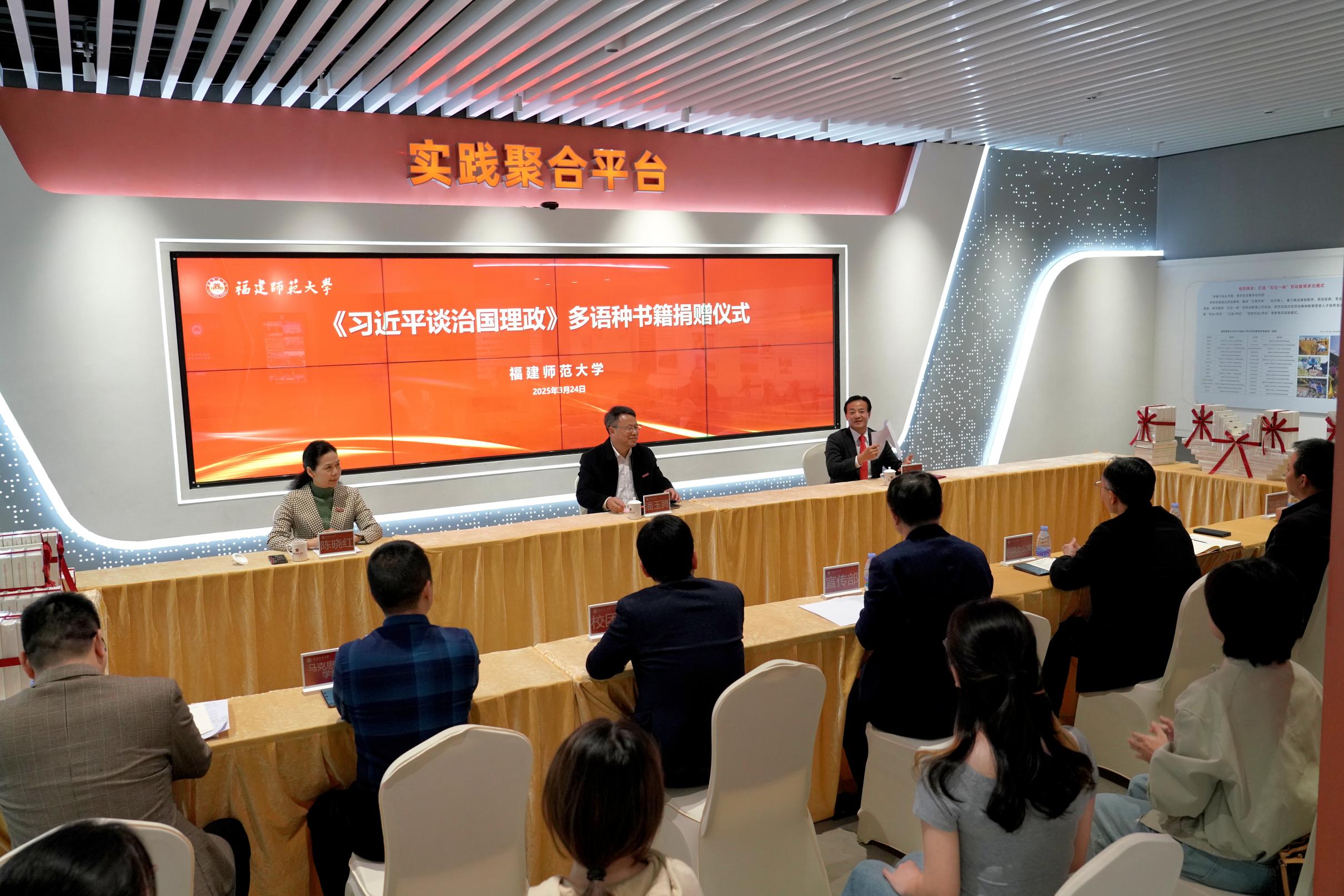 潘玉腾代表学校向捐赠单位表示诚挚感谢。他指出,《习近平谈治国理政》系列书籍,是习近平总书记执政理念和智慧的深刻体现,是马克思主义中国化时代化的重大理论创新成果。学校人文底蕴深厚,具有学习、研究和传播马克思主义理论的优良传统和坚实基础,今后将用好这批《习近平谈治国理政》多语种赠书,推动理论学习更系统更深入,研究阐释更加体系化学理化,理论宣传普及更有说服力感染力,为建设社会主义文化强国贡献师大力量。希望双方以此次赠书活动为契机,进一步加强交流与合作,共同讲好中国故事,传播好中国文化。
