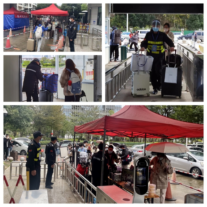 学生返校报到期间,保卫干部下沉一线、坚守岗位,分片包干两校区各门岗通道。保安队加强人员教育培训,各门岗保安提前做好各项准备工作,认真履职,主动帮助返校学生搬运行李,及时联系有关部门确认无入校码人员身份,协调后勤部门增派“小白”等校园公共交通车辆,通过温馨提示语音播报、提供饮用水等,营造良好的报到环境,让返校学生第一时间感受到“家的温暖”。校园“110”监控指挥中心和巡逻队对校园实行24小时线上与线下联动治安巡查,随时做好突发事件处置准备。同时,加强夜班力量,强化值班值守,确保深夜返校学生能够及时、顺利入校。