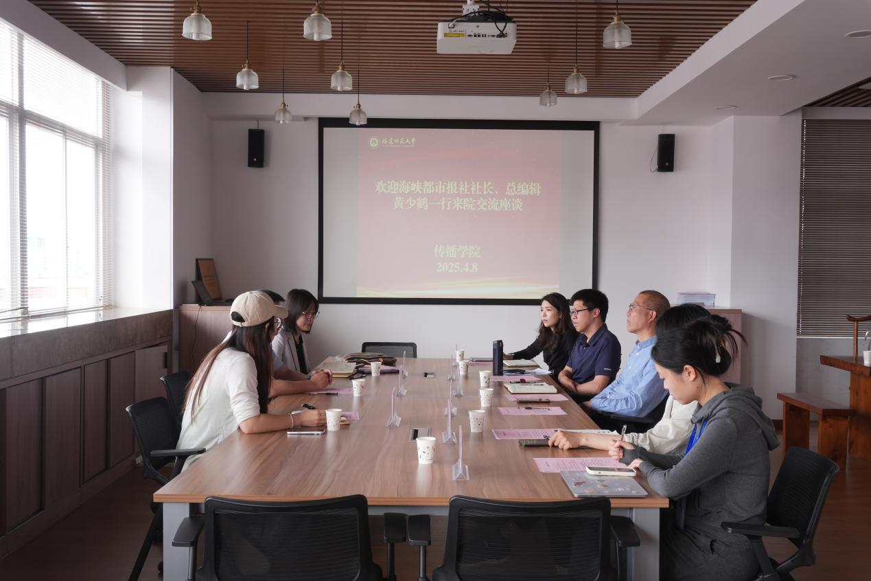 4月8日下午,海峡都市报社黄少鹤社长一行来传播学院交流座谈。传播学院党委书记郑文灿,新闻系主任吴鼎铭教授以及相关师生代表参加。会上,双方围绕产学研融合、实习实践、教学科研及个性化培养周教学成果等议题展开充分探讨。黄少鹤介绍了报社的发展历程及近年成果。郑文灿希望通过更进一步的校企合作,为学生搭建良好的实践、就业平台。个性化培养周期间,传播学院邀请海都报AI团队,面向全院学生推出《生成式人工智能短视频制作与应用》《生成式虚拟人的设计与驱动》等系列前沿理论课程。(传播学院)
