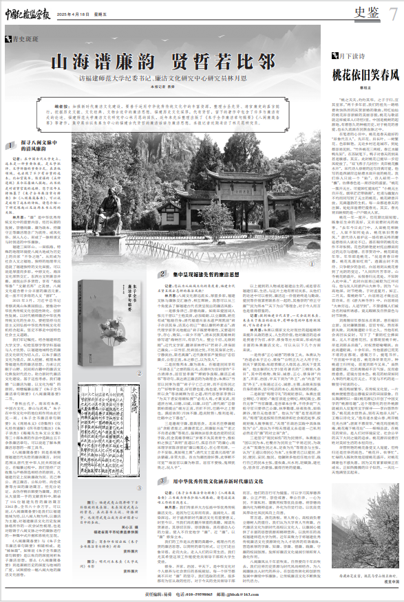 加强新时代廉洁文化建设,要善于运用中华优秀传统文化中的丰富资源,整理古圣先贤、清官廉吏的嘉言懿行,挖掘历史文献、文化经典、文物古迹中的廉洁思想。福建历史文化深厚,代有贤哲,留下的著作中包含了许多与廉洁有关的论述。近年来,完美网页版林月恩研究员团队依托学校文学、历史学、纪检监察学等学科优势,聚焦福建地域文化,先后主持编纂出版《朱子全书廉洁章句辑要》《八闽廉箴备要》等著作,集中展示福建古代贤哲的廉洁话语与廉洁思想,为加强新时代廉洁文化建设贡献“师大智慧”。4月18日,《中国纪检监察报》记者易舜就此专访校纪委书记林月恩研究员,从“探寻八闽文脉中的清风廉韵”“集中呈现福建先哲的廉洁思想”“用中华优秀传统文化涵养新时代廉洁文化”三个方面深入探讨传承弘扬闽派文脉廉脉,推进历史资源与时代风尚相结合,为八闽廉脉注入时代的养分,在创造性转化和创新性发展中赓续中华廉脉,让传统廉洁文化不断焕发时代活力。