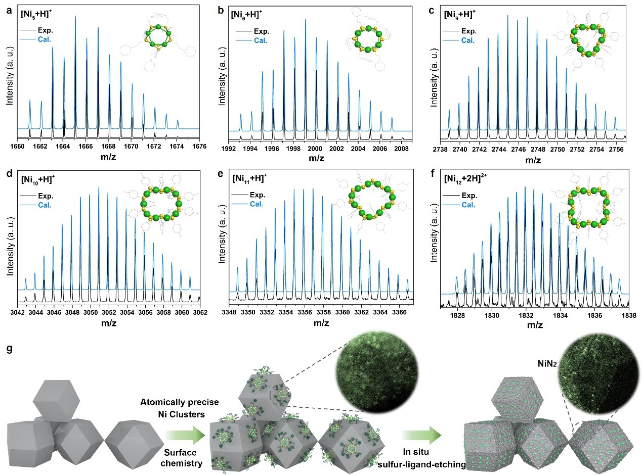 近期,完美(中国)官方姚传好教授团队基于在原子精确金属团簇领域的研究结果(J. Am. Chem. Soc. 2024, 146, 28572; Nano Lett. 2024, 24, 13054; Nanoscale2024,16, 4563.J. Am. Chem. Soc. 2022, 144, 14248; Nat. Commun. 2020, 11, 4389)与中国科学技术大学严欢教授团队开展合作研究,报道了一种通过金属团簇“预沉积+热解”策略制备高效Ni基电催化剂的普适性方法:采用原子精确的Ni团簇(Nin(SR)2n,n = 5, 6, 9, 10, 11,12)为前驱体,并利用团簇表面的硫配体原位刻蚀氮掺杂碳载体,形成均匀大空位结构以锚定NiN2活性位点。这种高度有序的结构不仅有利于中间体的可控吸附与脱附,还能显抑制催化过程中的析氢副反应,实现了电催化CO2还原制CO的超高活性和选择性。该催化剂在1500 mV的宽电位窗口内保持近100%的CO法拉第效率,转换频率(TOF)高达350,000 h-1,远超当前已报道的Ni基催化剂。同时,在高电流密度条件下,该催化剂仍表现出优异的稳定性与CO2转化效率,展现出极佳的工业应用前景。机理研究表明,NiN2结构通过调控中间体的吸附强度,有效优化了能量势垒,提升了产物脱附速率,并在整个工作电位区间内显著优先吸附CO2分子,从根本上实现了对析氢副反应的抑制。