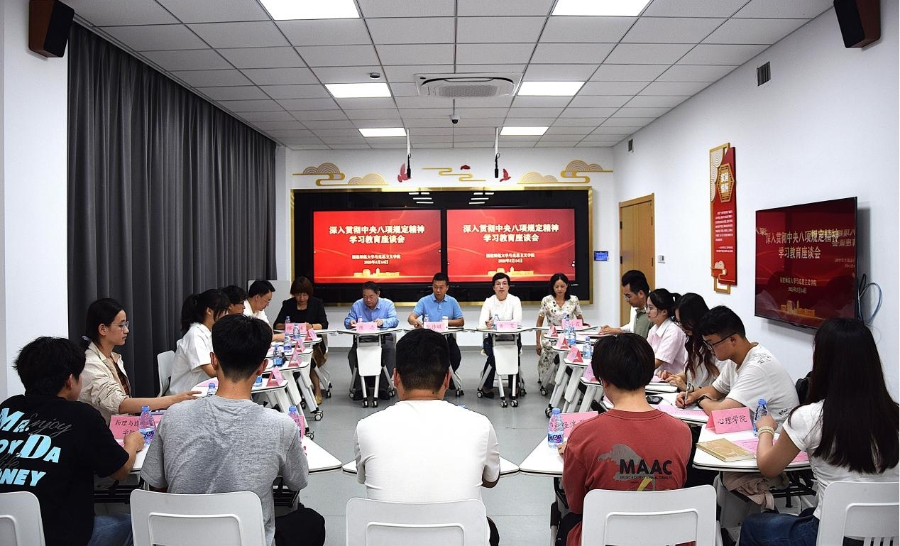 5月14日下午,马克思主义学院召开第二场深入贯彻中央八项规定精神学习教育座谈会,围绕思政课建设主题展开交流探讨。学院党委书记阮传瞰、副院长黄雯、各教研部代表以及来自教育学院、经济学院、化学与材料学院、地理科学学院等12个学院的硕士生和本科生代表参加了座谈会。