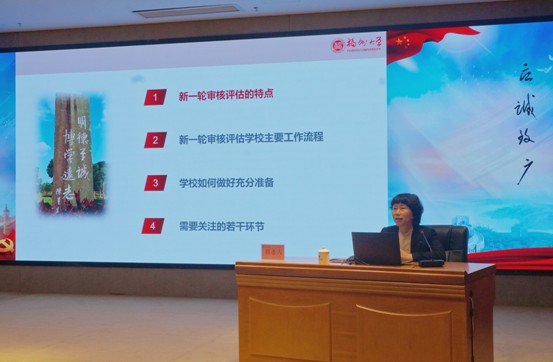 钟春玲聚焦新一轮审核评估,深入解读了新一轮审核评估的突出特点、主要工作流程以及需要关注的若干问题;围绕学校如何充分做好迎评工作,钟春玲结合福州大学评建经验,从学校和学院两个层面提出了具体的建议。