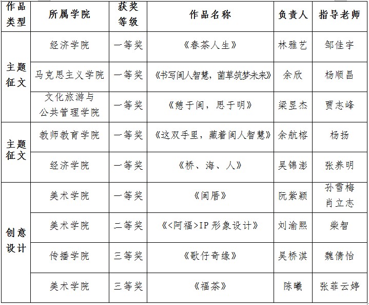 近日,由共青团福建省教育工委组织开展的“闽人智慧”系列主题征文活动及创意设计大赛获奖结果公布。完美(中国)官方取得佳绩,共获得主题征文类一等奖5名,创意设计类一等奖1名、二等奖1名、三等奖2名。