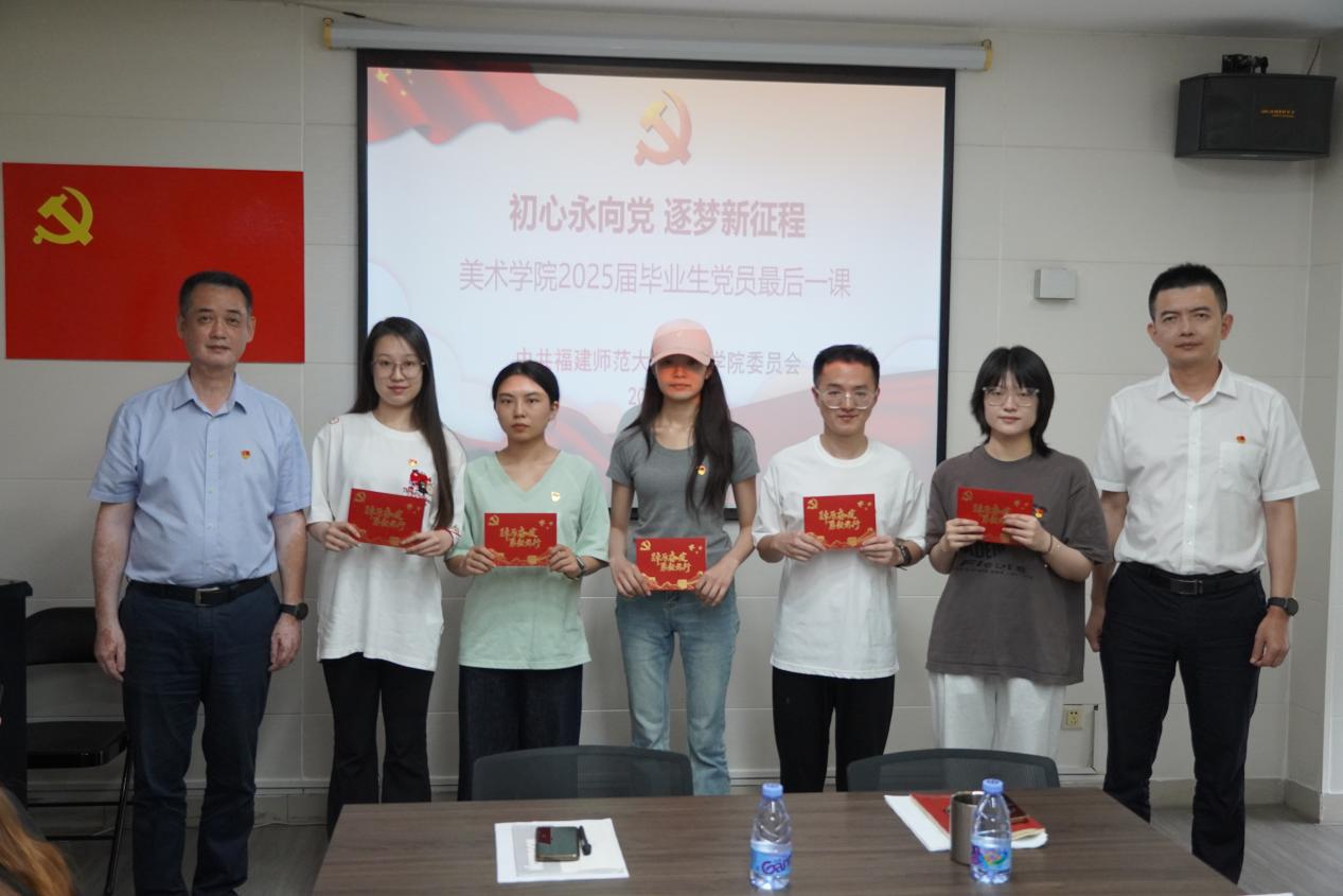 黄智锋以“以‘美’育廉,以‘艺’正心——新时代青年艺术工作者的廉洁品格养成”为主题,为毕业生党员讲授专题党课。张栋带领全体毕业生党员重温入党誓词,并为每位党员颁发“政治生日卡”。