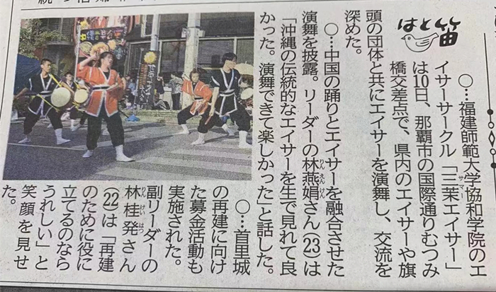 119-1112日,作为2018年福建省高校太鼓冠军大赛冠军,完美网页版协和学院三茉太鼓队一行12人受邀赴日本冲绳县那霸市参加2019年世界太鼓大会。交流团由张鹏程副院长任团长。