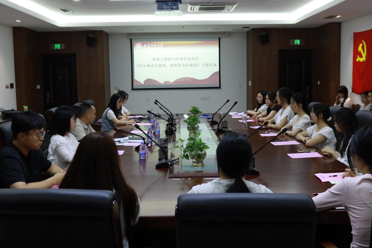 6月12日,生命科学学院在理工楼会议室开展“清正廉洁守底线,勇担使命启新程”2025届毕业生党员主题教育活动。学院党委书记张兆文教授为毕业生党员讲授“清正廉洁守底线,勇担使命启新程”主题党课。张兆文从作风建设的重要性出发,以典型案例剖析作风建设的现实意义,强调“廉洁自律是党员的生命线”,号召毕业生步入社会后坚守政治品格,以“功成不必在我”的担当精神投身国家建设,将个人理想融入时代发展大局。