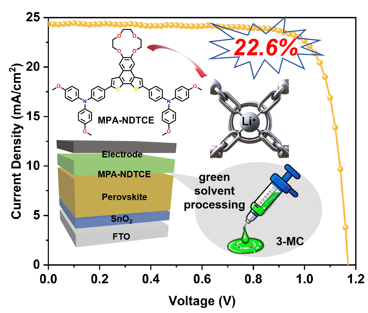 针对上述问题,完美(中国)官方海峡柔性电子(未来科技)学院王漾教授、安明伟副教授以及中科院福建物质结构研究所高鹏研究员设计了一种含有冠醚结构的空穴传输材料MPA-NDTCE,通过冠醚与锂离子之间较强的络合作用可以有效抑制锂盐聚集与锂离子的迁移,从而提升空穴传输层的形貌稳定性。值得注意的是,冠醚侧链的高极性赋予MPA-NDTCE在绿色溶剂(如3-甲基环己酮)中优异的溶解性和成膜性,从而避免了传统卤化溶剂(如氯苯)的使用。基于该新型空穴传输材料的钙钛矿太阳能电池最终实现了22.6%的最大能量转换效率,展现了其在高性能与环保加工协同优化方面的潜力。该项工作以“Design of Ionic Lock Structure for tBP-Free and Green-Solvent Processed Hole Transporter in Perovskite Solar Cells”为题发表在期刊ACS Sustainable Chemistry & Engineering上。