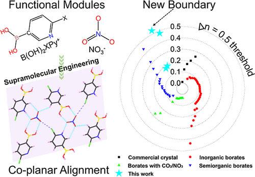 近期,该团队聚焦含B-O基团的硼酸盐体系,提出B-C π-骨架(B-C π-scaffolding)策略,即将吡啶基团和B-O基团通过B-C共价键连接,实现π共轭拓展。进一步将这种新型B-O功能基团与传统的NO3或C2O4,制备了一系列新型高性能双折射晶体。其中[HPyClB(OH)2]·(NO3)不仅具有宽的带隙和短波紫外可透过性,其双折射率更是高达0.533@546nm,这一数值不仅远超传统无机硼酸盐(如α-BBO, Δn = 0.12)和众多已报道的高性能双折射晶体,更是首次在B-O基材料体系中突破了Δn = 0.5的壁垒。该工作以“Breaking the Birefringence Barrier in B-O Crystals via B-C π-scaffolding”为题发表在期刊Journal of the American Chemical Society上。