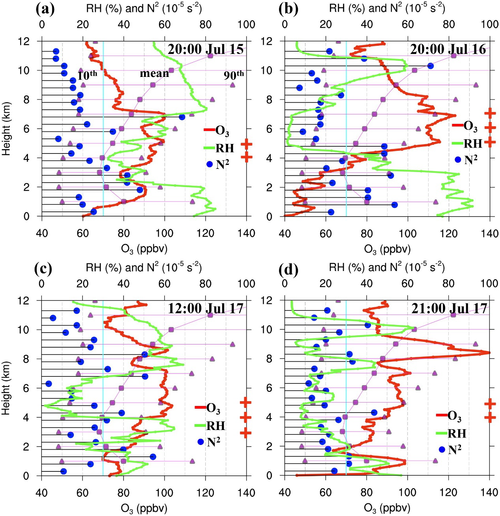 图为2024年7月15-17日引雷基地连续四次臭氧探空的观测结果,包括臭氧(红色线)、相对湿度RH(绿色线)和静力稳定度(蓝色点)。