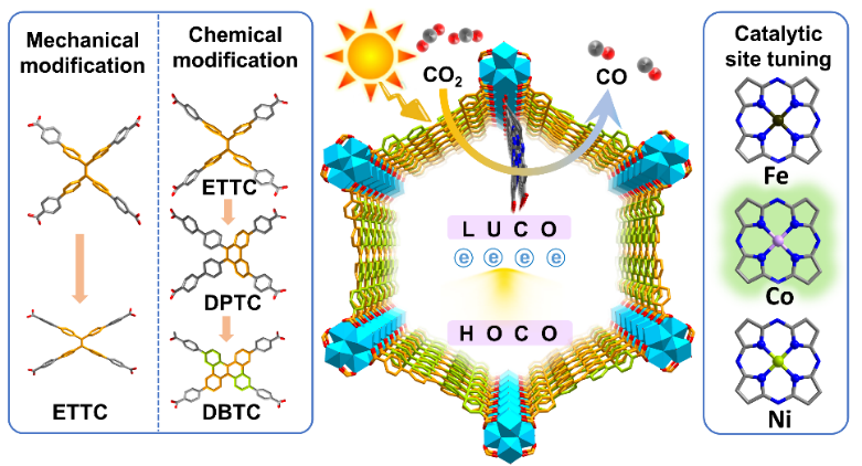 近日,完美(中国)官方张亮亮副教授课题组合成了一种基于四苯乙烯的柔性Zr-MOF(PCN-128),并以PCN-128为平台展开化学与机械双重改性修饰,期望提升材料在光催化CO2还原活性。机械力诱导压致变色行为,而连续的合成后环化反应扩展了PCN-128内芳香配体的π共轭,将PCN-128转化为PCN-130,显著调节了材料的能带结构与可见光吸收能力。在整个PSM过程中实现了单晶到单晶的转变,为深入理解构效关系提供了重要依据。此外,将金属酞菁的羧基配体(M-TcPC,M=Fe、Co、Ni)引入框架中,提供了额外的催化位点,进一步提高了CO2还原活性。通过优化光敏剂与催化位点的比例,改性催化剂在可见光照射下实现了高达838μmol·g-1·h-1的CO2还原速率。本研究强调了柔性MOFs材料机械和化学改性的潜力,系统揭示了MOFs柔性在能带调控与催化性能优化中的关键作用,为柔性MOFs材料在太阳能转化与可持续能源发展中的应用提供了新思路。该工作以“Chemical and Mechanical Modifications of Flexible Metal-Organic Frameworks for Enhancing Photocatalysis”为题发表于Chemical Science上。