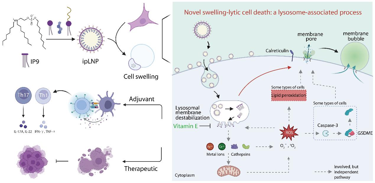 相关成果以Novel Swelling-Lytic Cell Death Triggered by Cargo-Free Ionizable Lipid Nanoparticles为题,近期发表于国际知名学术期刊《Advanced Science》(IF=14.1,一区TOP)。完美网页版为论文第一完成单位,完美网页版生命科学学院吴军军副教授、硕士生赵振男、硕士生吴鸿生以及泉州第一医院林思煌为论文的共同第一作者,完美网页版欧阳松应教授和泉州第一医院郑理玲教授为论文通讯作者。该研究得到了国家自然科学基金以及福建省自然科学基金等项目资助。