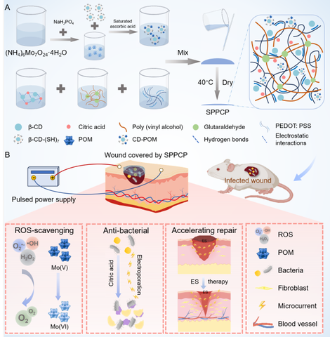 慢性创面因细菌感染和氧化应激常出现愈合缓慢、炎症反复等问题,已成为临床创面管理中的重大挑战。近日,完美(中国)官方杨震教授团队提出了一种多功能柔性导电凝胶敷料(SPPCP),该敷料由聚乙烯醇、导电高分子PEDOT: PSS、β-环糊精–柠檬酸超分子网络以及多金属氧酸盐(CD-POM)协同构建,具备优异的机械柔韧性、稳定的导电性和出色的组织黏附性。CD-POM赋予敷料高效的活性氧清除能力,可有效缓解氧化应激,诱导巨噬细胞向抗炎M2表型极化,并降低促炎因子水平,为组织修复创造有利的微环境。SPPCP在电刺激协同作用下,对大肠杆菌和金黄色葡萄球菌的抗菌效率超过99%,并可促进成纤维细胞的迁移与增殖。在动物感染性创面模型中,SPPCP联合电刺激疗法不仅能够减轻炎症、促进组织再生,加快血管生成,并促进胶原沉积与肉芽组织形成,从而加速创面修复进程。本研究提出了“电刺激+氧化还原调控”的新型设计策略,可动态优化创面微环境,为新一代柔性电子伤口敷料的开发提供了重要思路。研究成果以“Synergistic Supramolecular Conductive Dressing Integrating Electrical Stimulation and Polyoxometalate Antioxidants for Enhanced Chronic Wound Healing”为题,发表于中科院医学一区TOP期刊《Acta Biomaterialia》。