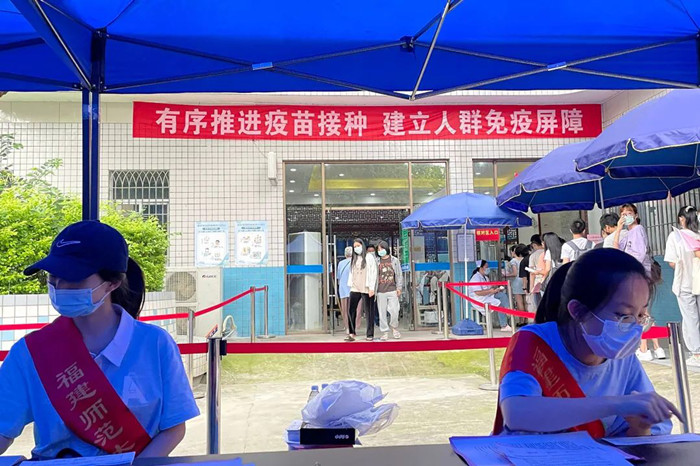 为提升师生疫苗接种的舒适度,校医院在原有基础上对接种各区域进行升级。增加空调、风扇、遮阳棚等设备物资应对高温天气,接种室由4个扩增至6个,增设协助接种人员的志愿者岗位,扩大观察区范围,大大提高了接种效率,单日接种量最多达6200多剂。