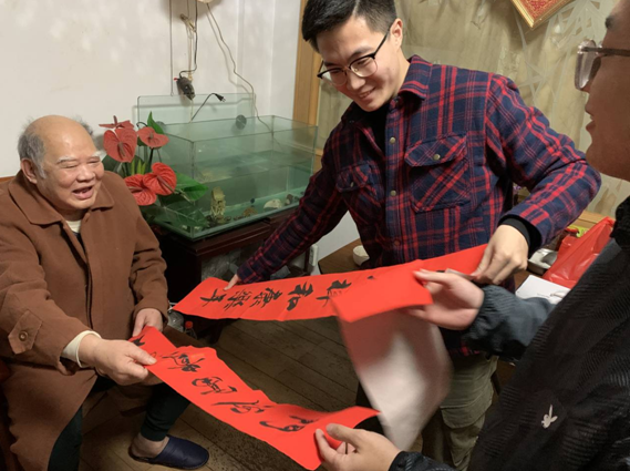 新春来临之际,法学院本科2016级第二党支部的五位党员来到陈宝涵老师家中提前拜年,为陈老师送上由学生张啸锋手写的春联。老少两代人交流分享学校建校往事和学院发展新动态。