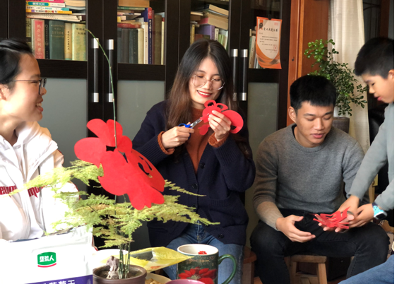 在胡江晚老师家中,法学院本科2016级第一党支部的五位党员与胡老师话家常、剪窗花,营造春节的喜庆氛围。