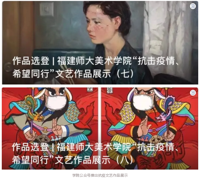 学院积极开展抗击疫情宣传教育。通过微信公众号陆续推送22篇原创作品,其中原创作品《美术学院研究生导师给研究生的一封信》获教育部学位中心就业等微信公众号引用;《美院师生用画笔致敬“逆行者”》《美术学院学生党支部筑牢抗“疫”战斗堡垒》《战“疫”有我,美院学子勇担当》《翁振新教授<战位有我 不辱使命>创作记》《携手同心|我们始终在一起!》《美院研究生用画笔绘制一线医护人员的战“疫”日记》获学校官方微信、福师大小葵等平台转发。此外,学院及时传达学校相关文件通知、普及疫情防范知识、扩散就业资讯等,转发推文31篇。