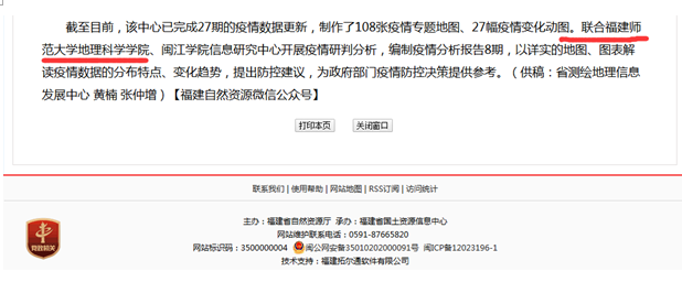 至今,系统一直持续稳定采集数据、更新图表,并已对公众发布疫情分析报告21期(地理科学学院为分析报告第一署名单位)。分析报告以翔实的地图、图表解读福建省疫情数据的地理分布特点、每日变化趋势,为民众提供了数据解读、为政府部门疫情防控提供政策建议。省自然资源厅在其网站和微信公众号同时以要闻播报报道了上述工作成果(http://zrzyt.fujian.gov.cn)。