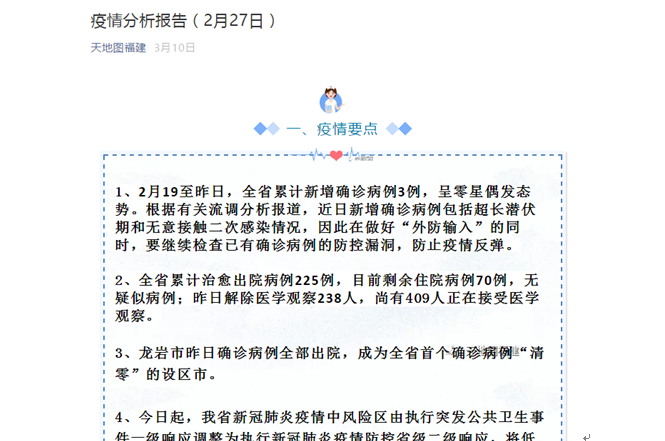 该团队利用开发的云端软件系统,实时获取全国各省市最新疫情数据、福建省省际迁入人口数据、省内各地级市之间人口迁移数据、确诊病例活动轨迹数据,综合本省疫情每日动态数据,制作福建省疫情防控相关趋势图表、轨迹地图;撰写每日疫情分析报告,解读疫情数据、提出防控政策建议。报告经突击队领导审核后,通过“天地图·福建”微信公众号对外发布。