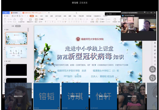3月25-30日,授课学生深入漳州艺术实验学校、福清港头中学等省内多所中小学开展线上云课堂。直播课上,他们详细介绍国内外疫情现状,以及战“疫”中展示出的中国速度、中国力量、中国担当、中国精神,生动讲述防疫路上的一个个感人故事。同时,带领学生一起演唱由音乐学院学生创作的原创歌曲《等待花开的时候》。