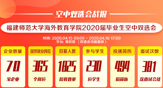 4月15日至16日,海外教育学院2020届毕业生空中双选会顺利举行。本次线上双选会通过“易校招大学生就业平台”开展,共有来自全国各地的70家企事业单位参加选聘,包括福州理工学院、泉州聚龙外国语学校、北京中公教育、福建瑞维光电等,提供就业岗位365个。本次空中双选会共吸引院内外230位毕业生投递简历494份,开展线上面试381次。