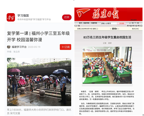 附属小学开学复课举措获得人民网、学习强国、福建日报、福建教育厅官微、福建共青团官微、东南网、今日头条、福州广播电视台少儿频道等众多媒体关注报道。