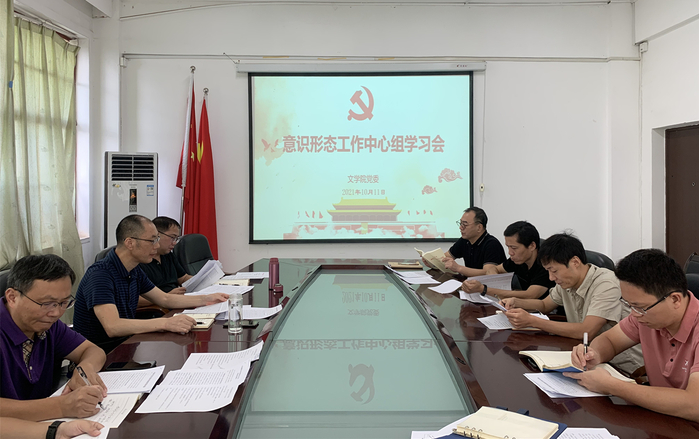 近日,文学院举办党史学习教育专题读书班暨理论学习中心组(扩大)学习会,围绕“习近平总书记关于意识形态工作的重要论述”进行集体学习,交流心得体会。院党委理论学习中心组成员和教师代表、辅导员参加了会议。