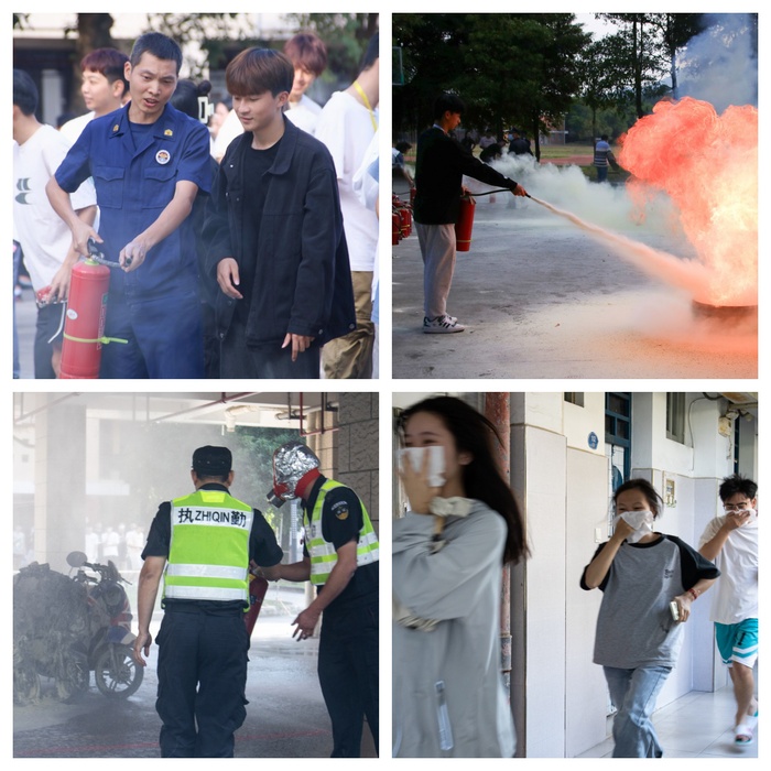 闽侯县消防救援大队上街站队员负责对宿舍发生火灾时如何正确逃生自救,以及如何使用灭火器等进行详细讲解,并现场指导参加演练的师生员工进行灭火实操。