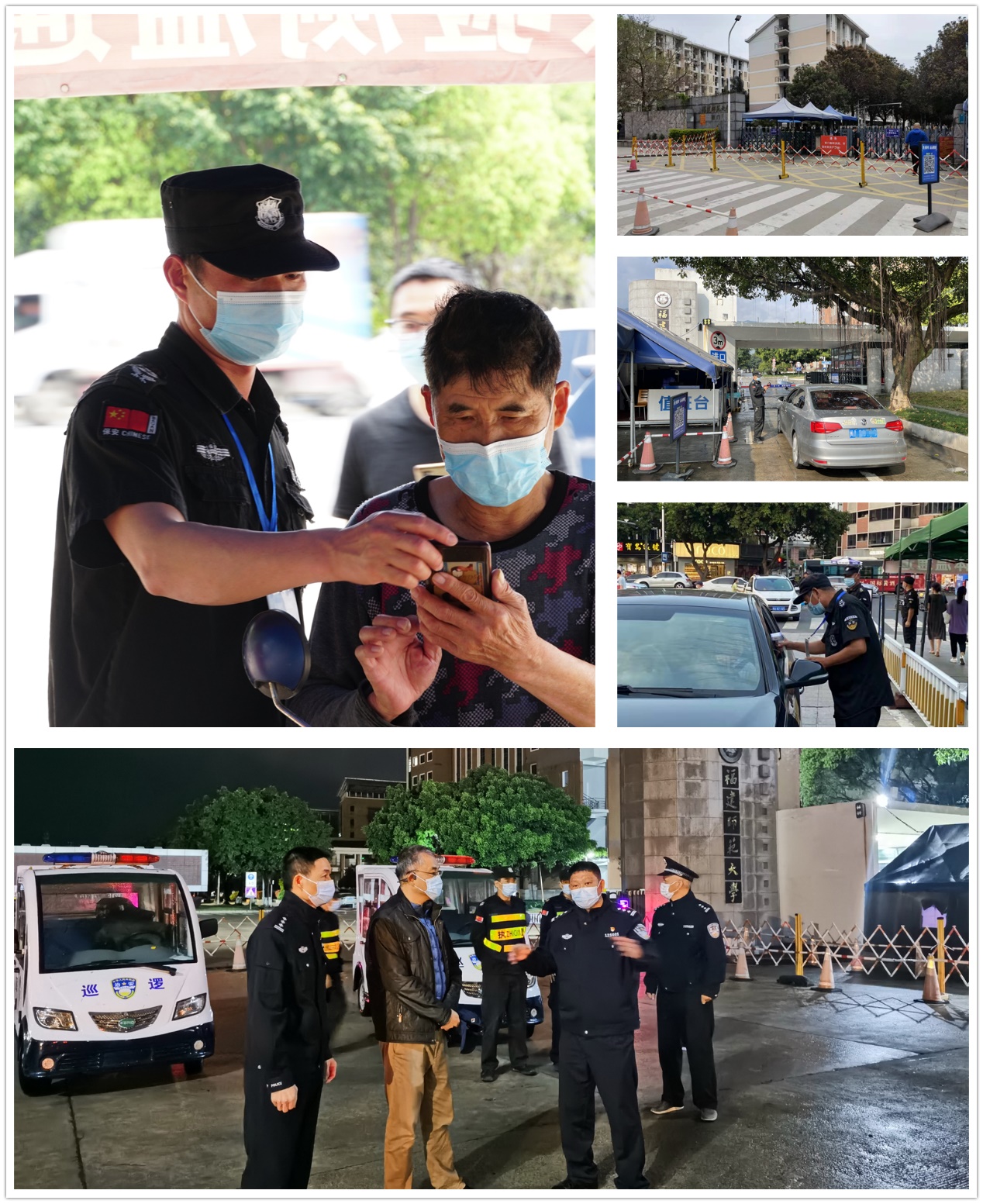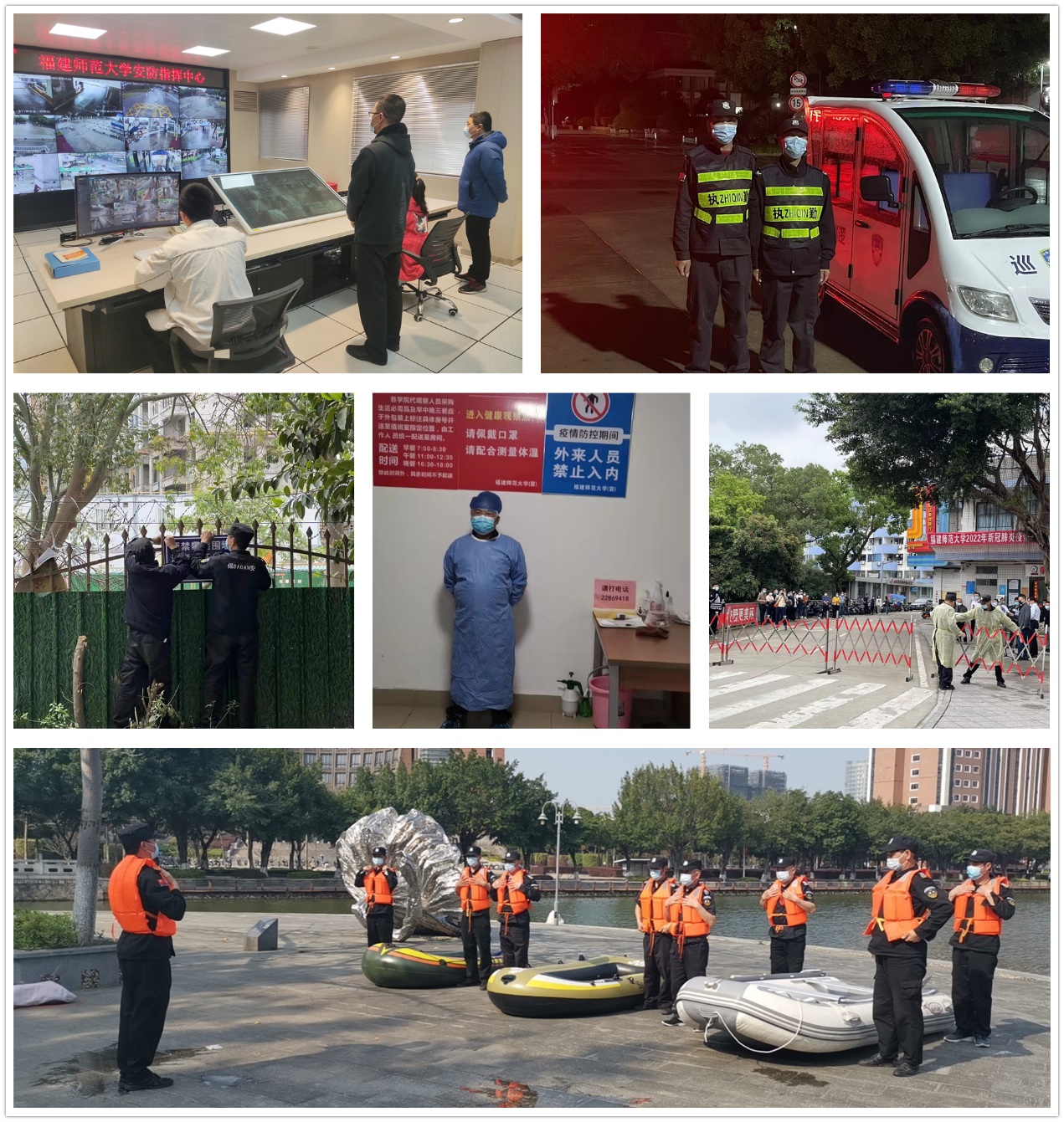 根据上级和学校防疫工作部署,处(部)快速响应,第一时间修订校园管控方案和保安员防疫工作指南,落细落实疫情防控相关责任要求;加大安保队伍自身健康监测和防护,及时配足配齐口罩、消毒液、防护服等防疫物资;临时关闭仓山、旗山校区多个校门;严格通行校门的管控,强化入校人员身份核验及健康检查;适时修订入校码发放、审批程序,加大对管理员审批的指导和监管;及时增设人脸识别通道,优化入校人员管理核验流程。