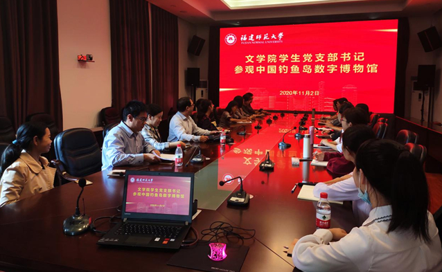 11月2日,文学院党委在老校部民主楼三楼会议室召集学生党支部书记参观钓鱼岛数字博物馆。院党委副书记叶祖淼、闽台区域研究中心师生联合党支部副书记吴巍巍、组织员郭静虹以及学生党支部书记共近20人参加会议。