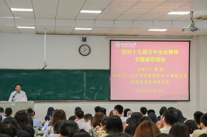 11月18日下午,公共管理学院党委邀请福建省人民政府发展研究中心原副主任、省委宣讲团成员黄端在旗山校区笃行1-113教室为师生作《新阶段新理念新格局新征程——学习贯彻党的十九届五中全会精神》专题辅导报告。学院党委理论学习中心成员、全体教职工、学院党建骨干队伍培训班成员、学生党员、学生代表等聆听了报告。